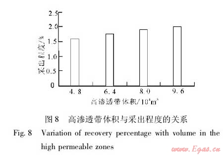 圖7描述了高滲透帶數(shù)量為8簇時,單簇高滲透帶體積與累積產量的關系。單簇高滲透帶體積為8.0×104m3時,累積產量為4790.8t,采出程度1.9%;高滲透帶體積為9.6×104m3時,累積產量4995.8t,采出程度2.0%(圖8)。可見,隨著高滲透帶體積增加,累積產量、采出程度增加,當單簇高滲透帶體積大于8.0×104m3時,累積產量、采出程度增加減緩。為最大限度地提高本井采出程度,兼顧斷層影響,最終確定單簇高滲透帶體積為9.6×104m3。