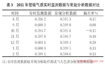 (2)在線色譜分析儀安裝投運(yùn)后,為驗(yàn)證該臺(tái)色譜儀實(shí)際運(yùn)行效果,從2011年8月開(kāi)始,對(duì)色譜儀氣質(zhì)實(shí)時(shí)監(jiān)測(cè)數(shù)據(jù)和常規(guī)取樣分析數(shù)據(jù)進(jìn)行對(duì)比(表3)。從投運(yùn)7個(gè)月的天然氣相對(duì)密度對(duì)比情況來(lái)看,實(shí)時(shí)監(jiān)測(cè)數(shù)據(jù)與常規(guī)監(jiān)測(cè)數(shù)據(jù)最大偏差出現(xiàn)在12月,為0.28%,其余月份偏差較小。除儀器固有分析誤差和常規(guī)分析時(shí)產(chǎn)生的泄漏等人為或器械故障原因?qū)е鲁霈F(xiàn)不可克服的分析偏差外,色譜儀實(shí)時(shí)監(jiān)測(cè)數(shù)據(jù)運(yùn)行總體保持平穩(wěn)。根據(jù)實(shí)時(shí)監(jiān)測(cè)數(shù)據(jù)變動(dòng)情況可知,10月初因下游用氣需求發(fā)生較大變化,期間壓減了某一氣源的日接氣量,導(dǎo)致相對(duì)密度變化較大。此時(shí)如果采用常規(guī)分析檢測(cè)手段將無(wú)法實(shí)時(shí)反映這種氣質(zhì)變化,從而導(dǎo)致產(chǎn)生較大計(jì)量偏差。而安裝在線色譜儀后,可以實(shí)時(shí)采集到管道內(nèi)的最新氣體組分,便于在上游進(jìn)行流程切換時(shí),及時(shí)掌握氣質(zhì)變化情況,提高了計(jì)量精度[3]。
