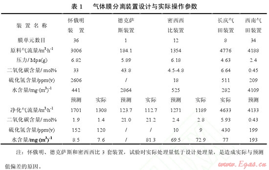 實(shí)際上從 20 世紀(jì) 80 年代以來,國內(nèi)外許多公司把膜分離技術(shù)應(yīng)用于天然氣凈化領(lǐng)域,做了大量的試驗(yàn)工作。表 1 是國內(nèi)外 5 套氣體膜分離裝置的設(shè)計(jì)與實(shí)際操作參數(shù),其中:懷俄明、德克薩斯和密西西比等 3 套裝置,采用美國格雷斯(GRECE)膜系統(tǒng)公司直徑為203.2mm的膜分離器[1];長慶氣田裝置,采用中科院大連化學(xué)物理研究所直徑為 200mm 的膜分離器,在原料氣處理量 12×104m3/d、壓力 5.4Mpa、溫度6~33℃條件下,經(jīng)膜系統(tǒng)凈化處理后,凈化氣壓力在 4.6Mpa時的水露點(diǎn)達(dá)到-13℃,甲烷回收率≥98%[2] ;西南油氣田裝置,由大連歐科膜技術(shù)工程有限公司負(fù)責(zé)成套,采用德國原裝進(jìn)口直徑為 150mm 的膜分離器[3],設(shè)計(jì)原料氣處理量10×104m3/d、壓力2.4Mpa、溫度 50℃條件下,天然氣脫水率>85% 、甲烷損失率 <1% 、水露點(diǎn):冬季<0℃ 、夏季<10℃ 。