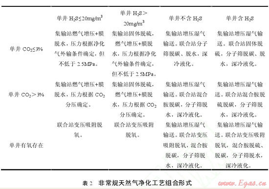 針對非常規(guī)天然氣單井氣質(zhì)條件不同,可以選擇不同的處理工藝。主要分為凈化氣管道外輸和凈化氣液化運(yùn)輸兩種類型,根據(jù)氣質(zhì)條件的不同,選擇不同的脫硫、脫水具體工藝如表 2 所示。