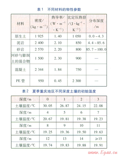 為了使數(shù)值計(jì)算結(jié)果更接近實(shí)際,考慮了土壤豎直方向的分層現(xiàn)象,根據(jù)重慶地區(qū)的現(xiàn)場勘測結(jié)果,沿土壤豎直方向依次為原生土、泥巖、砂巖。對于水平地埋管換熱器,回填材料為原生土。豎直地埋管換熱器鉆孔的回填材料為河砂與膨潤土的混合物。對于樁基螺旋地埋管換熱器,樁基內(nèi)部為混凝土,外部為原生土。不同材料的物性參數(shù)見表l。由表l中原生土、泥巖、砂巖的分布深度可知,水平、樁基螺旋地埋管換熱器所在深度只涉及原生土,豎直地埋管換熱器所在深度涉及原生土、泥巖、砂巖。