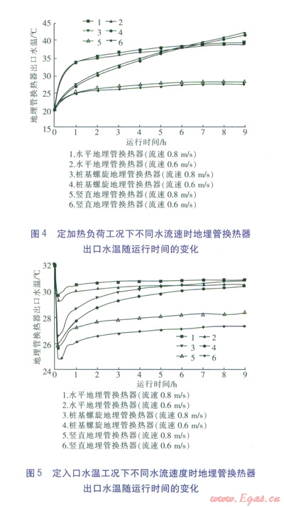 在定加熱負(fù)荷工況下,不同水流速度時(shí)地埋管換熱器出口水溫隨運(yùn)行時(shí)間的變化見圖4。由圖4可知,豎直地埋管換熱器出口水溫最低,換熱性能最好。運(yùn)行前期,樁基螺旋地埋管換熱器出口水溫低于水平地埋管換熱器,隨著運(yùn)行時(shí)間的延長,樁基螺旋地埋管換熱器出口水溫升高較快。運(yùn)行6 h后,樁基螺旋地埋管換熱器出口水溫高于水平地埋管換熱器。