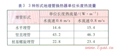 由于采取定入口水溫,不同形式地埋管換熱器單位長度(對于豎直地埋管換熱器為單位鉆孔長度)熱流量不同(見表3)。由表3可知,在運(yùn)行時(shí)間內(nèi),3種地埋管換熱器中豎直埋管換熱器的單位長度熱流量最大。樁基螺旋地埋管換熱器的單位長度熱流量高于水平地埋管換熱器,但樁基螺旋地埋管換熱器的出口水溫在運(yùn)行后期上升較快,可以推斷,隨著運(yùn)行時(shí)間的進(jìn)一步延長,這兩種地埋管換熱器單位長度熱流量的差距會逐漸縮小。
