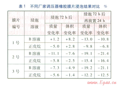 液態(tài)正戊烷對(duì)橡膠膜片的腐蝕性低于B溶液。為了驗(yàn)證液態(tài)正戊烷和B溶液對(duì)橡膠膜片腐蝕程度的差異性,國(guó)家燃?xì)庥镁哔|(zhì)量監(jiān)督檢驗(yàn)中心財(cái)3個(gè)不同調(diào)壓器廠家的橡膠膜片(分別編號(hào)為1號(hào)、2號(hào)和3號(hào))按照標(biāo)準(zhǔn)中規(guī)定的試驗(yàn)方法,分別采用液態(tài)正戊烷和B溶液進(jìn)行浸泡,浸泡結(jié)果見(jiàn)表1