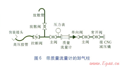 對于在卸氣柱上增加質量流量計的工藝。是從CNG加氣機的工藝流程借鑒過來的,還應該在流量計之前增加壓力表,為卸氣柱增加一個箱體,另外,拉斷閥、單向閥(此處的單向閥還有防止管道氣逆流時,保護質量流量計的作用)必須加裝。帶質量流量計的卸氣柱見圖6。