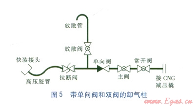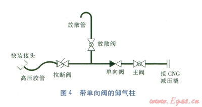 在卸氣柱卸氣過程中,由于工作人員的疏忽,在更換第二輛CNG氣瓶車時,誤操作將第一輛和第二輛CNG氣瓶車所連接的卸氣柱主閥同時打開。這時就會造成第二輛車內(nèi)的CNG反充入第一輛車(尤其是CNG減壓橇流量不大的時候),使得第一輛車內(nèi)的余氣量增加,影響正常運營。為了防止工作人員誤操作所帶來的問題,可以在卸氣柱主閥的前面增加一個單向閥。帶單向閥的卸氣柱見圖4。