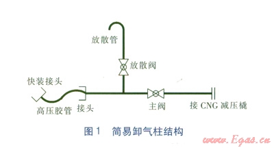 簡易卸氣柱由連接CNG氣瓶車的快裝接頭、高壓膠管、主閥、放散閥、連接管道組成。簡易卸氣柱結構見圖l。