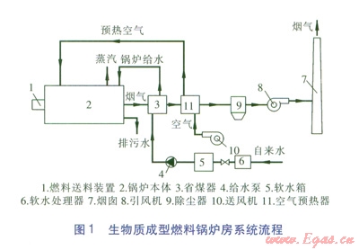 生物質(zhì)成型燃料鍋爐房系統(tǒng)流程見圖l。鍋爐房由鍋爐本體、燃料送料裝置、送引風(fēng)機(jī)、軟水處理器、除塵器等組成。鍋爐房的燃料(生物質(zhì)成型燃料)、水、煙氣、空氣的流程與常規(guī)燃煤鏈條爐排鍋爐房近似。