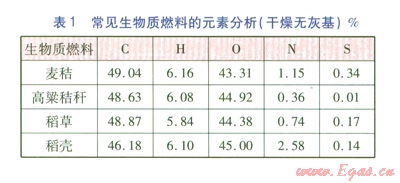 常見生物質(zhì)燃料的元素分析(干燥無灰基)見表1。由表1可知,生物質(zhì)燃料含碳量較少,質(zhì)量分?jǐn)?shù)一般小于50%,因此生物質(zhì)燃料不耐燒,發(fā)熱量較低。生物質(zhì)燃料含硫量很低,質(zhì)量分?jǐn)?shù)大多低于0.20%,甚至為零,因此燃用生物質(zhì)燃料的燃燒設(shè)備不必設(shè)置脫硫裝置,以降低設(shè)備造價(jià)。
