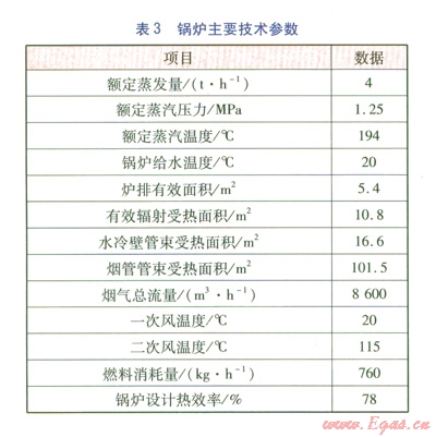 鍋爐外形尺寸(長(zhǎng)××)6.8 m×2.7 m×3.8 m,所燃用的生物質(zhì)成型燃料低位發(fā)熱量為16.4 MJkg。鍋爐主要技術(shù)參數(shù)見表3。在鍋爐蒸發(fā)量達(dá)到設(shè)計(jì)能力的工況下,經(jīng)權(quán)威部門測(cè)試,其熱效率達(dá)88%以上,排煙溫度為120135℃,達(dá)到設(shè)計(jì)要求。測(cè)試依據(jù)為TSG G0003-2010《工業(yè)鍋爐能效測(cè)試與評(píng)價(jià)規(guī)則》、TSG G0002-2010《鍋爐節(jié)能技術(shù)監(jiān)督管理規(guī)程》。