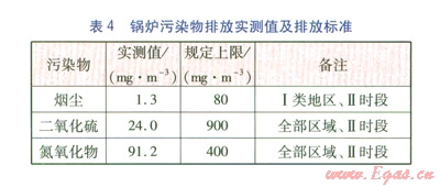經(jīng)環(huán)保部門檢測(cè),鍋爐污染物排放實(shí)測(cè)值及規(guī)定上限見表4。執(zhí)行標(biāo)準(zhǔn)為GB l3271-2001《鍋爐大氣污染物排放標(biāo)準(zhǔn)》。由表4可知,各項(xiàng)污染物排放指標(biāo)符合要求。