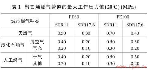 1.2.2 在聚乙烯燃?xì)夤艿赖膲毫υO(shè)計(jì)中,還需要考慮到燃?xì)庵兴姆枷銦N類(lèi)物質(zhì)所產(chǎn)生的影響,以及管道的施工條件等因素,根據(jù)國(guó)家相關(guān)的行業(yè)標(biāo)準(zhǔn),聚乙烯燃?xì)夤艿涝试S的最大工作壓力如表1