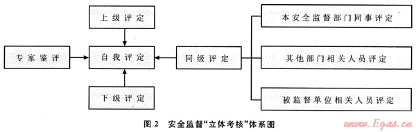 1) 安全監(jiān)督考核的實(shí)施應(yīng)遵循如下步驟:建立一個科學(xué)的考核機(jī)構(gòu),多方收集信息;進(jìn)行“立體考核”,上級評定安全監(jiān)督“立體考核”體系(見圖2)。