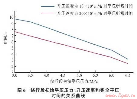 按照15m3/h20m3/h的升壓速率,從繞行段整體升壓至3MPa開始,計算完全平壓所需要的時間,得出繞行段初始壓力、升壓速率和時間之間的關(guān)系曲線(圖6)。繞行段升壓至4.5MPa后,按照20m3/h的升壓速率,完全平壓需要5.5h;在繞行段升壓至5.2MPa后,按照15m3/h的升壓速率,完全平壓需要6h。為確保升壓盡快完成,同時考慮安全因素和計算誤差,選擇在繞行段升壓至4.5MPa作為進氣平壓點。