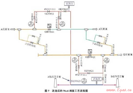 對No.6閥室進行工藝改造,增加二級節(jié)流,通過兩級降壓解決節(jié)流降溫和振動問題。利用DN300管道將兩閥室的放空口進行連接(圖7藍色線條部分),并加裝2個注氮閥,加裝1臺節(jié)流截止放空閥GLV06231個壓力表。為解決節(jié)流造成的振動對放空管道的影響,在GLV0612GLV0622節(jié)流截止放空閥之間的放空管道加裝壓重塊,然后回填并夯實。