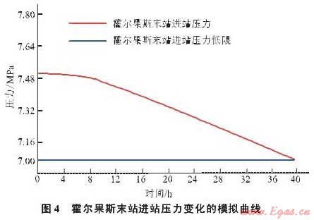 根據(jù)中亞天然氣管道霍爾果斯末站的進站壓力7.5MPa和出口流量700m3/h的工況進行模擬計算,No.8.2閥室關(guān)閉36h后,霍爾果斯末站進站壓力降到7.1MPa(圖4),即No.8.2閥室關(guān)閉36h后將影響到下游正常運行。