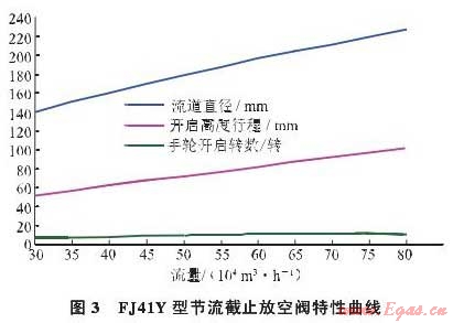 No.6閥室的旁通和放空截止閥均采用FJ41Y-600節(jié)流截止放空閥,根據(jù)廠家提供的該閥滿足流量、壓差的開度范圍,模擬壓差為80.2MPa的節(jié)流特性曲線(圖3)。在(3080)萬m3/h的流量條件下,FJ41Y型節(jié)流截止閥的流道直徑、開啟高度行程、手輪開啟的轉(zhuǎn)數(shù)與通過流量呈線性關(guān)系。當(dāng)手輪開啟5.8轉(zhuǎn)時,通過流量將達到30m3/h,遠遠超出置換投產(chǎn)期間的控制流量;當(dāng)手輪每開啟0.5轉(zhuǎn)時,通過流量將增加5m3/h。