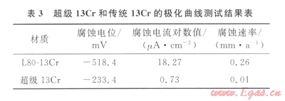 極化曲線測(cè)試結(jié)果如圖l、表3所示。可以看出,超級(jí)l3Cr的腐蝕電位較傳統(tǒng)的L80-13Cr顯著正移,其腐蝕速率更是遠(yuǎn)小于L80-13Cr的腐蝕速率,僅為0.01 mma。
