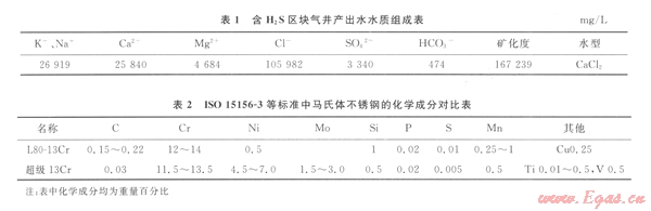 陜北地區(qū)某區(qū)塊氣井產(chǎn)水量大、產(chǎn)出水C1-含量高(超過(guò)l00 gL),特別是其H2S分壓達(dá)到0.15MPaCO2分壓為1.8 MPa。為保證井筒管柱的長(zhǎng)期安全,就超級(jí)13Cr和傳統(tǒng)13Cr管材的性能和適應(yīng)性進(jìn)行對(duì)比評(píng)價(jià)。表l為該區(qū)塊氣井產(chǎn)出水的水質(zhì)情況,表2ISO標(biāo)準(zhǔn)所規(guī)定的兩種材料的化學(xué)成分對(duì)比。