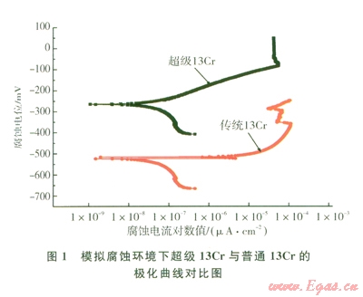采用Princeton-M370電化學(xué)測(cè)試系統(tǒng)對(duì)超級(jí)13C和傳統(tǒng)L80-13Cr試樣進(jìn)行極化曲線測(cè)試,測(cè)試范圍:相對(duì)于自腐蝕電位的-l50+350 mV,掃描速率0.166 mVs,電化學(xué)試樣規(guī)格為øl4 mm×3 mm,常溫。試驗(yàn)介質(zhì)同表l。