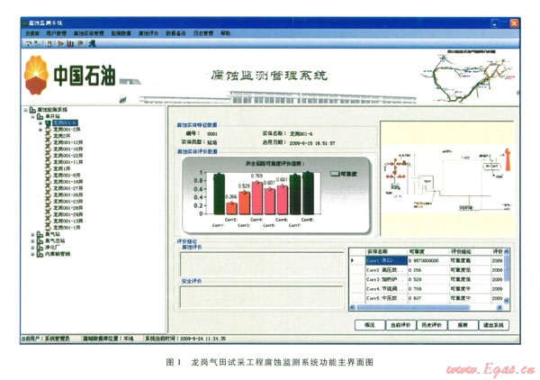 圖l為龍崗氣田試采工程腐蝕監(jiān)測(cè)系統(tǒng)功能主界面圖,通過中間數(shù)據(jù)庫實(shí)現(xiàn)與龍崗氣田數(shù)字化巡檢系統(tǒng)和三維地理信息系統(tǒng)的數(shù)據(jù)交互,實(shí)現(xiàn)腐蝕數(shù)據(jù)的圖形展示,為管理者提供決策依據(jù)。
