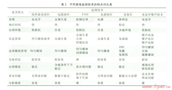 高含硫氣田用腐蝕監(jiān)測(cè)技術(shù)包括線性極化探針、電感探針、電阻探針、FSM、電化學(xué)噪聲技術(shù)等,不同腐蝕監(jiān)測(cè)技術(shù)由于工作原理不同具有個(gè)體的適應(yīng)性和彼此的差異性。各腐蝕監(jiān)測(cè)技術(shù)對(duì)比情況如表2所示。