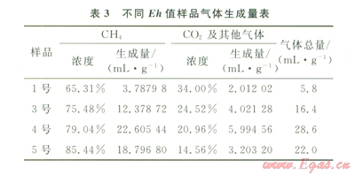 實(shí)驗(yàn)結(jié)果表明:在實(shí)驗(yàn)室條件下,樣品在不同Eh條件下均可持續(xù)生成CH4,同時(shí)生成了C02、N2及其他氣體。不同Eh條件下氣體生成量及氣體濃度如表3,圖l、2所示。
