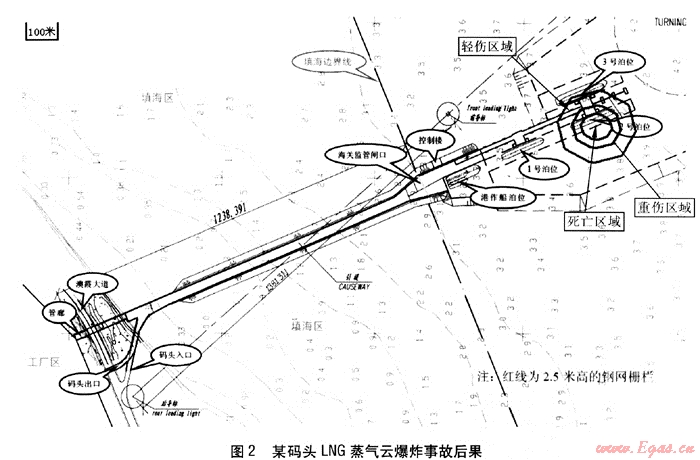 ② 從發(fā)生蒸氣云爆炸后果看,人員死亡、重傷半徑、輕傷半徑分別為40m、69m、117m;暴露在戶外的碼頭作業(yè)人員及船員將遭受重傷以上的傷害,停泊在碼頭的船舶及LNG管道、裝卸臂等設(shè)備設(shè)施將遭受嚴(yán)重破壞。