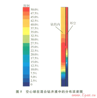 泵入的空心球與鉆井液混合流體中空心球的含量為40%,經(jīng)過分離后,大部分空心球由于密度的差異和環(huán)空流動的影響進(jìn)入環(huán)空,環(huán)空分離點以上空心球體積達(dá)到50%,分離點以下僅有少量的空心球(小于2%)未實現(xiàn)有效分離。如圖5所示,空心球在注入點以上環(huán)空內(nèi)分布均勻,能夠有效降低環(huán)空分離點以上鉆井液的密度,實現(xiàn)多梯度鉆井技術(shù)。