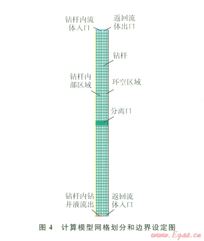 井下多相流分離的順利實施是多梯度鉆井技術(shù)實現(xiàn)的關(guān)鍵。采用FLUENT混合物(Mixture)模型[7-8]建立空心球注入模型,網(wǎng)格劃分及邊界條件如圖4所示。假設(shè)混合了空心球的鉆井液是不可壓縮流體,由于正常鉆進(jìn)時鉆井液的流量基本恒定,可假定鉆井液的流動是定常流動。在直角坐標(biāo)中混合流體的運(yùn)動控制方程[9]: