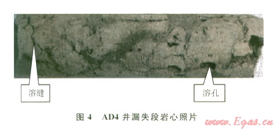 塔河油田l2區(qū)探井AD4井,處于構(gòu)造洼地,AD4井南面發(fā)育有東西向斷裂,東面發(fā)育有南北向斷裂。地震資料顯示井區(qū)T47界面附近有強(qiáng)振幅串珠狀異常反射(3)。振幅變化率處理成果統(tǒng)計(jì)分析表現(xiàn)為強(qiáng)振幅變化率,相干屬性為較弱相干。鄰井鉆井完井資料顯示,7 口井中有2口在奧陶系一問房組發(fā)生漏失(其中TKl013井共漏失鉆井液905 m3,溢流153.55 m3),2口在恰爾巴克組發(fā)生漏失。鄰井巖心分析顯示,巖石主要成分為泥微晶顆?;?guī)r,測試顯示供液能力50 m3d左右。