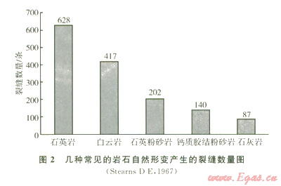 巖石在構(gòu)造應(yīng)力作用下會(huì)發(fā)生變形,當(dāng)變形超過破裂強(qiáng)度時(shí)巖石將發(fā)生破碎,產(chǎn)生裂縫。不同的巖石在相同的應(yīng)力作用下形變不同,產(chǎn)生的裂縫數(shù)也不相同,即強(qiáng)度決定巖石裂縫的多少(2)。