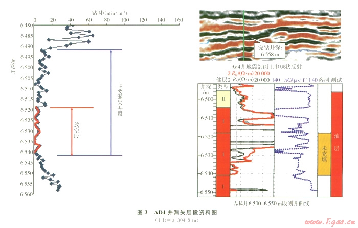 鉆井完井過程中,在奧陶系一間房組6 486.02 m發(fā)生井漏,在鉆進(jìn)過程中發(fā)生間斷性漏失。其中6 491.866 541.0 m段為主要井漏段,其中6 518.006 541.00 m段強(qiáng)行鉆進(jìn)過程中,鉆壓060 kN,鉆進(jìn)液漏失速率4460 m3h,鉆時(shí)一般維持在25minm,部分井段鉆時(shí)1 minm,故認(rèn)為此段為放空段,漏失段長23 m。隨后發(fā)生多次溢流,經(jīng)多次壓井才順利完鉆,共漏失鉆井液7 042 m3。最大漏速70 m3h,平均漏速40.9 m3h。地震、測井資料均顯示此段漏失嚴(yán)重(3)。