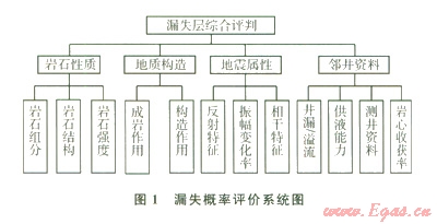 根據(jù)井漏漏失通道的影響及反應(yīng)特征,建立了評價(jià)系統(tǒng)(1)。圖l的巖石性質(zhì)、地質(zhì)構(gòu)造、地震屬性、鄰井資料是綜合評判系統(tǒng)的高層次指標(biāo)。