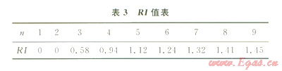 對于l9階判斷矩陣,Saaty給出RI的值,見表3