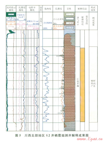 當(dāng)儲(chǔ)層內(nèi)的流體為低礦化度的地層水或淡水時(shí),由于水中呵移動(dòng)的導(dǎo)電離子數(shù)大量減少,從而導(dǎo)致電阻率值增加,在測(cè)井電阻率曲線上則表現(xiàn)出高電阻率特征。由于隨著勘探程度的不斷提高,勘探家們?cè)絹?lái)越認(rèn)識(shí)到淡水地層的電阻率類同氣層,電阻率值較高,因而按常規(guī)解釋易出偏差,這也是HS1井柄霞組水層呈現(xiàn)出高電阻率特征易解釋失誤的原因。K2井棲霞組巖性主要為淺灰-灰色細(xì)-中晶白云巖,粗晶(砂糖狀)白云巖發(fā)育。巖心分析物性表明,孔隙度分布范圍介于0.42%~l 6.61%,孔隙度在各個(gè)區(qū)間分布較為平均,平均孔隙度為3.03%,明顯較HS1井高(圖2),儲(chǔ)層物性特征明顯較致密的HS1井好,屬于中等-好儲(chǔ)層。從K2井儲(chǔ)層測(cè)井解釋看,棲霞組儲(chǔ)層電性特征具有低伽馬值、高電阻率、相對(duì)較高的聲波時(shí)差特征,無(wú)疑具有典型的氣層特征(圖5)。但通過該井MDT取樣分析卻表明:儲(chǔ)層段產(chǎn)水。根據(jù)本井MDT水樣分析資料,其Cl-含量?jī)H164 mg/L礦化度低,反映儲(chǔ)層中的水為淡水特征。
