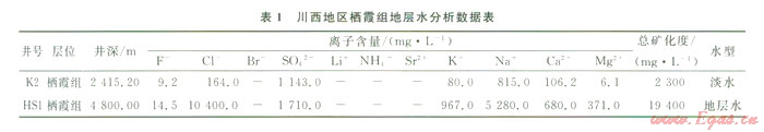 按導(dǎo)電機(jī)理的不同,巖石可分成兩大類,離子導(dǎo)電的巖石和電子導(dǎo)電的巖石,前者主要靠連通孔隙中所含的溶液的正負(fù)離子導(dǎo)電;后者靠組成巖石顆粒本身的自由電子導(dǎo)電。高阻水層的形成主要受宏觀地質(zhì)背景、微觀孔隙結(jié)構(gòu)、孔隙充填物以及流體性質(zhì)等因素的影響。從電性特征看,川西南部的漢深l井與川西北部的礦2井電阻率都較高,根據(jù)該區(qū)岡版解釋儲(chǔ)層流體具有典型的氣層特征,但測(cè)試結(jié)果卻與測(cè)井解釋存在著較大差異,兩口井均產(chǎn)水。從其水化學(xué)分析結(jié)果看,兩者水的性質(zhì)也存在較大差異,從K2井水分析資料來(lái)看:Cl-含量?jī)Hl 64 mg/L,反映地層水為低礦化度的NaHC03型淡水,而HS1井則為高礦化度的CaCl2型地層水(表1)。雖然兩者都產(chǎn)水,但是由于其水的性質(zhì)不同,因而兩者代表著不同的成藏過程和地質(zhì)意義。下面分別分析高阻水層的成因。