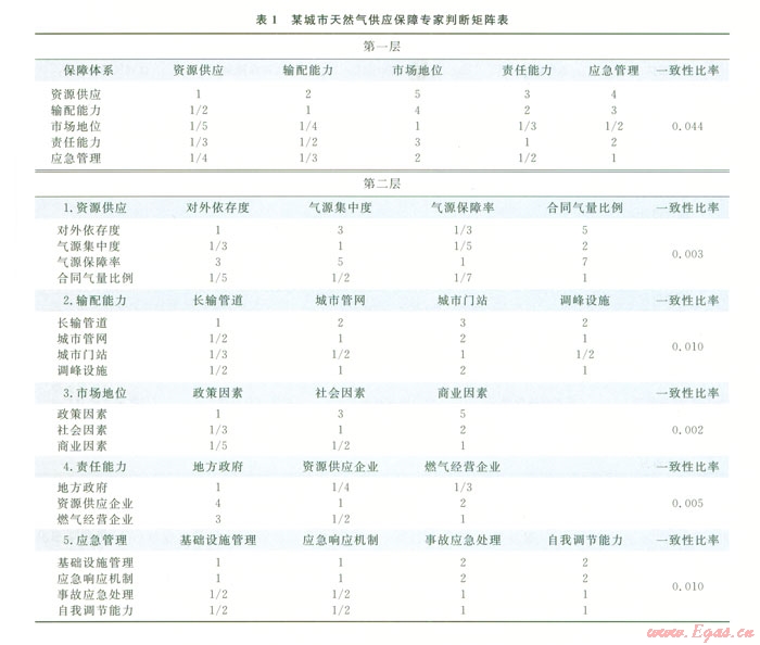 本文從天然氣產(chǎn)、運、銷物流系統(tǒng)整體出發(fā),同時納入“政府、企業(yè)、用戶”三方責任承擔與應急管理評價指標,形成一套城市供氣安全的綜合保障評價體系。同時采用成熟的層次分析法建立數(shù)學模型,分別計算指標權重與模型得分,定性分析和定量計算相結合,對城市的供氣保障形成直觀認識。計算實例表明,模型在分析影響城市供氣安全不利因素、提高認識的準確水平,以進一步增強城市供氣保障措施和安全系數(shù),具有一定的輔助分析作用。