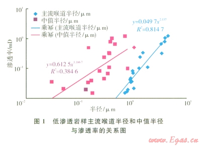 喉道大小及分布是控制儲層滲流能力的關(guān)鍵。定義對滲透率累積貢獻(xiàn)達(dá)95%以前喉道半徑的加權(quán)平均值為主流喉道半徑。須家河組不同儲層巖樣主流喉道半徑和中值半徑與滲透率關(guān)系表明(1),主流喉道半徑隨滲透率的增加而增加,二者之間存在非常好的正相關(guān)關(guān)系;但是中值半徑與滲透率之間的相關(guān)性較差。這說明主流喉道半徑不僅能表征儲層基質(zhì)的滲透能力,而且能夠反映儲層微觀孔隙結(jié)構(gòu)特征。