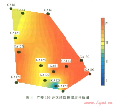 2)廣安2井區(qū)須六段儲層中部南北向為氣藏富集區(qū),東、西兩翼儲層為Ⅲ、Ⅳ類儲層。廣安106井區(qū)須四段儲層整體為Ⅲ、Ⅳ類儲層,西北翼和南部儲層相對較好。