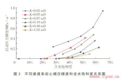 低滲透砂巖含水氣藏巖樣滲流實驗表明,當(dāng)含水飽和度較高時,氣體滲流出現(xiàn)非達(dá)西流現(xiàn)象,存在閾壓梯度[8]。閾壓梯度與巖心滲透率及含水飽和度相關(guān)(2),巖心滲透率越低,含水飽和度越高,閾壓梯度越大。閾壓梯度可作為衡量儲層流動性強弱的指標(biāo),也是影響儲量動用程度的重要參數(shù),因此,將閾壓梯度作為低滲含水儲層評價參數(shù)是必要的。