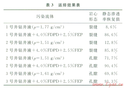 為評(píng)價(jià)暫堵油保劑返排效果,測(cè)定了現(xiàn)用鉆井液體系中加入暫堵油保劑前后該地區(qū)巖心滲透率恢復(fù)值(3)。