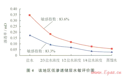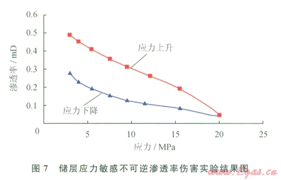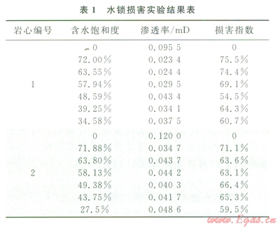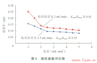 2)中等速敏和壓力敏感損害:儲(chǔ)層巖心液測(cè)速敏實(shí)驗(yàn)表明,在15mLmin的測(cè)定流量范圍內(nèi),巖心的最小滲透率Kmin和最大滲透率Kmax分別為0.1029mD0.2514mD0.08mD、0.155mD,臨界流量為22.5mLmin,KminKmax分別為0.410.52,液測(cè)速敏損害較強(qiáng)(6)。儲(chǔ)層巖心應(yīng)力敏感實(shí)驗(yàn)結(jié)果由實(shí)驗(yàn)結(jié)果可知:該地區(qū)低滲透儲(chǔ)層的應(yīng)力敏感性為中等損害,滲透率由0.49mD降低為應(yīng)力變化后的0.275mD,其應(yīng)力敏感引起的不可逆滲透率損害率為43.9(7)