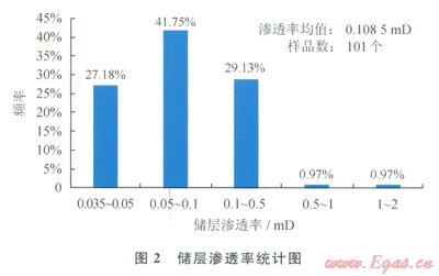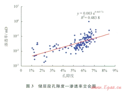通過(guò)對(duì)該地區(qū)儲(chǔ)層段巖樣統(tǒng)計(jì)分析表明,儲(chǔ)層孔隙度主要集中分布在6%~8(1),平均孔隙度為6.72%;儲(chǔ)層段樣品滲透率主要集中在0.0350.5mD,占98.06(2),平均滲透率為0.1085mD。儲(chǔ)層孔隙度和滲透率二者存在較好的指數(shù)相關(guān)性,R達(dá)到0.6988,滲透率隨孔隙度增大而增大(3)。因此,該區(qū)儲(chǔ)層屬于低孔、低滲透性儲(chǔ)層。
