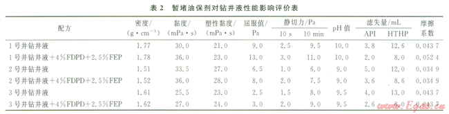 為考察暫堵油保劑加入后鉆井液性能的變化,采用了該地區(qū)現(xiàn)場(chǎng)鉆井液加入4FDPD多級(jí)架橋暫堵粒子和2.5FEP可變形軟化粒子前后的流變性能對(duì)比實(shí)驗(yàn)(2)