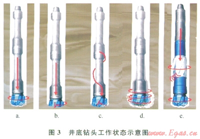 TorkBuster(阿特拉公司)將鉆井液的流體能量轉(zhuǎn)換成高頻(680~2400次/rain)、均勻穩(wěn)定的扭向機(jī)械沖擊能量并直接傳遞給PDC鉆頭實(shí)現(xiàn)瞬時(shí)破巖,此時(shí)PDC鉆頭上就有兩個(gè)力在切削地層,一個(gè)是轉(zhuǎn)盤提供的扭力,一個(gè)是TorkBuster提供的扭向沖擊力,相當(dāng)于每分鐘額外680~2400次切削地層,使鉆頭不需要等待積蓄足夠的能量就可以切削地層,消除了“卡—滑”現(xiàn)象,保持鉆頭對(duì)地層切削的連續(xù)性(圖3-e),因此能夠大幅提高機(jī)械鉆速,延長(zhǎng)鉆柱壽命,提高鉆井效率。