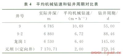 攻克了螺桿等鉆具無法攻克的二疊系極堅(jiān)硬玄武巖,單趟最大進(jìn)尺827m,除l5號(hào)井因鉆井液不適應(yīng)地層導(dǎo)致此井段出現(xiàn)5趟起下鉆外,大部分井實(shí)現(xiàn)兩趟從三疊系鉆完第二次開鉆的Æ241.3mm至奧陶系,平均單井節(jié)約時(shí)間達(dá)30.27d,大幅降低鉆井周期、提高了鉆井效率;井深6785m的直井9號(hào)同時(shí)應(yīng)用了此兩種提速技術(shù),平均機(jī)械鉆速l0.69m/h,鉆井周期僅55d,提速效果遠(yuǎn)高于鄰井9-2號(hào)和其他油田相似深度井[8-12]。(表4)。能夠消除“卡—滑”現(xiàn)象并保持鉆頭對(duì)地層連續(xù)切削的TorkBuster配合高抗沖擊的專用PDC鉆頭U513M提速技術(shù)對(duì)塔北地區(qū)三疊系—奧陶系地層具有良好的適應(yīng)性。