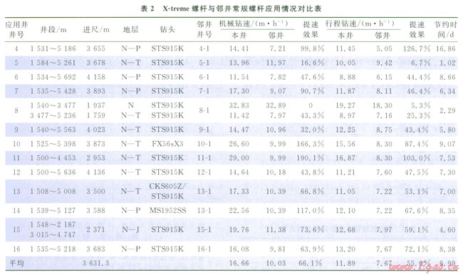X-treme螺桿(Æ203mm)+PDC鉆頭復(fù)合鉆井技術(shù)在塔北地區(qū)哈拉哈塘、新墾、熱普區(qū)塊13口井第二次開鉆的Æ241.3mm井眼上部井段進(jìn)行了應(yīng)用,應(yīng)用地層為新近系—三疊系、部分井進(jìn)入二疊系頂部,平均單井進(jìn)尺3631.3m,平均機(jī)械鉆速和行程鉆速分別為l6.66m/h和11.89m/h,表2為X-treme螺桿(Æ203mm)與鄰井常規(guī)螺桿應(yīng)用情況對(duì)比。