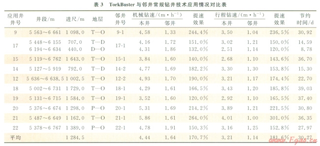 第二階段對(duì)鉆頭進(jìn)行優(yōu)化,配合針對(duì)塔北地區(qū)設(shè)計(jì)的PDC鉆頭U513M在10口井第二次開鉆的Æ241.3mm下部井段進(jìn)行了應(yīng)用,應(yīng)用地層為三疊系—奧陶系,平均單井進(jìn)尺1284.5m,平均機(jī)械鉆速和行程鉆速分別為4.44m/h和3.2lm/h,與鄰井同井段應(yīng)用常規(guī)鉆井技術(shù)相比,分別提高170.7%和181.6%;表3為TorkBuster與鄰井常規(guī)鉆井技術(shù)應(yīng)用情況對(duì)比,TorkBuster+U513M技術(shù)提速效果顯著。