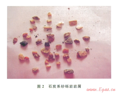 3)石炭系一志留系:主要為砂泥巖不等互層、石灰?guī)r和礫巖。地層堅(jiān)硬,硬度達(dá)2232MPa,抗壓強(qiáng)度達(dá)221.2MPa,可鉆性差,砂巖研磨性強(qiáng),機(jī)械鉆速慢且鉆頭損耗快,PDC鉆頭平均機(jī)械鉆速約為2m/h,而三牙輪鉆頭平均機(jī)械鉆速約為1.5m/h;部分區(qū)塊石炭系含有砂礫巖(圖2),對(duì)PDC鉆頭破壞性強(qiáng)。